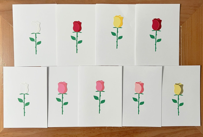 These handmade paper flower cards were received and accepted by Wicked Good Cards on December 21, 2025 as a single donation of forty cards. The collection includes a wide range of floral designs, featuring tulips and roses in both large single formats and smaller grouped sets, along with iris, daffodil, daisy, sunflower, and lily designs. All of these flowers are familiar, everyday blooms commonly seen across Maine.